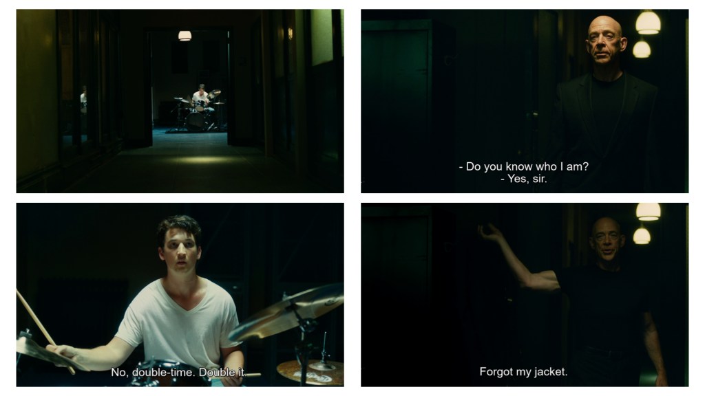 Fletcher’s abusive nature persists throughout the film; especially in how he uses mind games to test Andrew’s resilience and push him to work harder. Upon inviting Andrew to join his studio band, Fletcher purposely misguides him into turning up three hours early, and in rushing to get there, Andrew ends up hurting himself falling down some stairs. In fact, Andrew continuously injures himself throughout the story at Fletcher’s behest, and many times under unnecessary circumstances, suggesting that even in spite of his own goals, Fletcher enjoys his position of power above others. When he eventually arrives, Fletcher approaches Andrew in an uncharacteristically amicable way and questions him on his background, which he later weaponises to humiliate Andrew in front of the other members of the band, again to diminish his self-worth and pressure him into working harder.