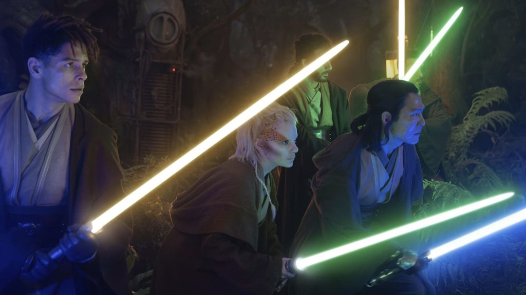Nevertheless, where pen and performance may have failed to bring The Acolyte to life, it’s at the very least apparent that there was a production team behind this that did care about making the show look its best – even if the old idiom “you can’t polish a turd” remains evergreen in this case. Given that it takes place in an as-yet unseen era of Star Wars, there’s plenty of fun new ship and droid designs found throughout the show, but with a fair number of visual references to the Prequel Trilogy too, and I personally enjoyed seeing the more ornate and clean look in the architecture of the Jedi Temple which serves as a nice visual cue that the series of course takes place further back in the timeline. In fact, the set design is pretty solid across the board, especially in busier scenes that are well dressed with aliens walking around in the background and a sense of permanence to the environments that doesn’t often exist in many of the other Star Wars shows rolled out on Disney Plus that only seem to bother popping actors in front of Volume soundstages with barren backdrops and hoping for the best. Obviously taking inspiration from the likes of The Matrix and similarly high-octane action films from East Asia, the fight choreography in The Acolyte is impressively complex, albeit at times feeling a little stiff with some very obvious wire work or CGI enhancements taking you out of the action here and there, but broadly speaking the show is well-composed at a visual level which at the very least puts it a step above many of the Filoni-led projects at Lucasfilm as of late. Still, the direction is by no means perfect – although the soundtrack is by-and-large serviceable (if not a little forgettable), the strange decision to have a rap music needle-drop at the end of an episode totally obliterates any sense of tonal consistency with the rest of the Star Wars brand, and frankly just reminds me that in spite of the positives, fun visuals won’t fix a rotten script from an undisciplined showrunner.